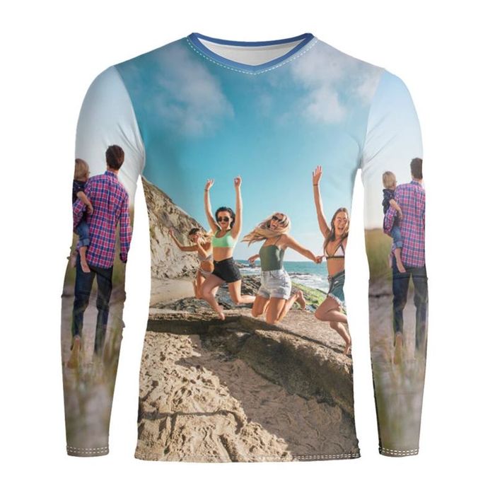 Unsere weichen Jersey-Stoffe sind ideal zum Bedrucken und Fertigen dieser hautengen T Shirts. Das Material ist fantastisch für satte, kräftige Farben, und selbst feinste Details und filigrane Muster werden tadellos wiedergegeben. Die Vorder- und die Rückseite, sowie beide Ärmel und auch der Nackenbund werden separat von dir gestaltet. Nutze das gleiche Foto oder verschiedene Motive, ganz wie du möchtest.