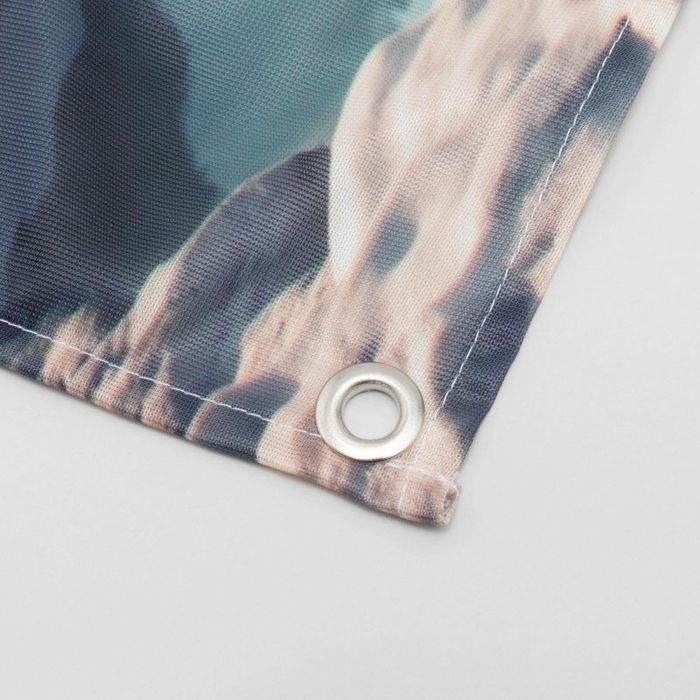 Bitte beachten: Der Stoff kann beim Druckprozess um bis zu 2% einlaufen. Plane dies ein, falls es auf die genauen Maße ankommt. Die Ösen oder die Stangenlasche findest du standardmäßig an der linken Seite. Möchtest du eine andere Ausrichtung, rotiere dein Design vor dem Bestellen.