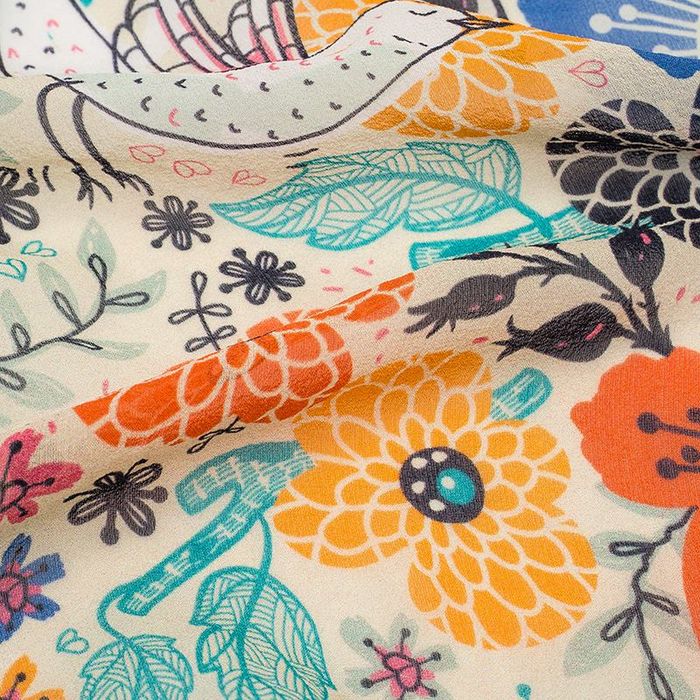 Georgette, auch Crêpe Georgette, ist eine leichte Variante des Kreppstoffs. Das Material wird normalerweise aus Seide gefertigt, kann jedoch auch aus dünnen Kunstfasern hergestellt werden. Der Krepp-Effekt wird erzielt, indem die Schuss- und Kettfäden vor dem Verweben stark verdreht werden. Wenn der fertige Stoff vom Webstuhl genommen wird, kringeln sich die Fäden ein und kreieren so für einen Stoff mit körnigem, trockenem Griff. Da Georgette von Natur aus transparent ist, wird Kleidung aus dem Material mit einem Innenfutter versehen. Der Kreppstoff ist beinahe vollkommen knitterfrei und ideal für die Herstellung von Brautkleidung, Abendkleidung und Inneneinrichtung, wie feine Vorhänge, geeignet. Obwohl der Stoff transparent ist, werden deine Motive klar und scharf abgebildet.