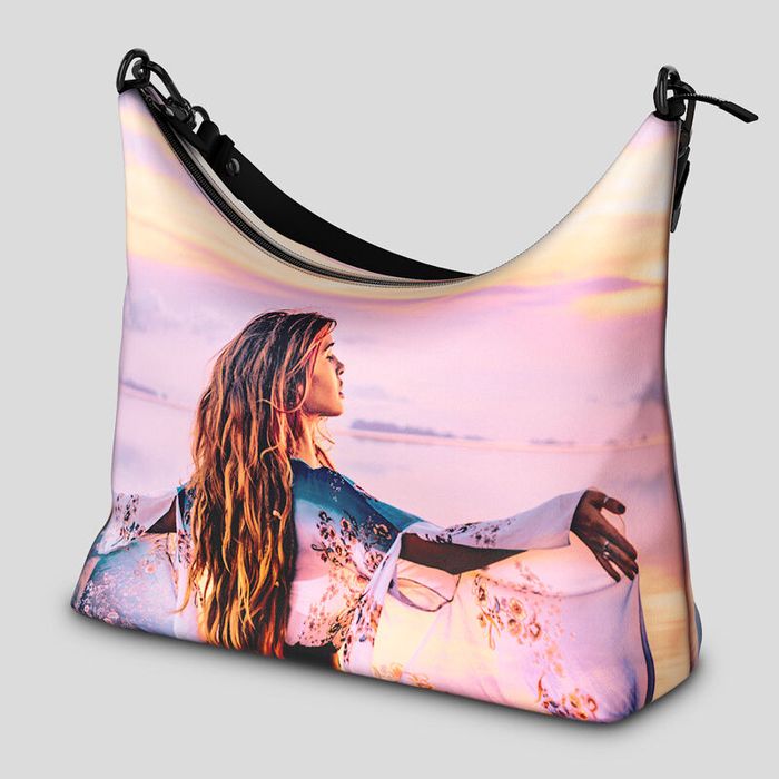 Wenn du eine Hobo Bag bedrucken lassen möchtest, dann liegst du hier richtig: Da wir sie auf Bestellung anfertigen, stehen dir viele verschiedene Produktoptionen zur Auswahl, mit denen deine Tasche so richtig individuell wird. Beide Seiten deiner Hobo Bag gestaltest du einzeln mit den Fotos, Grafiken oder Schriftzügen deiner Wahl. Wähle ein schönes Foto für eine Seite und ein motivierendes Zitat für die andere, erstelle eine Fotocollage für eine Seite und nutze ein einzelnes Foto auf der anderen Seite, die Wahl liegt ganz bei dir.
