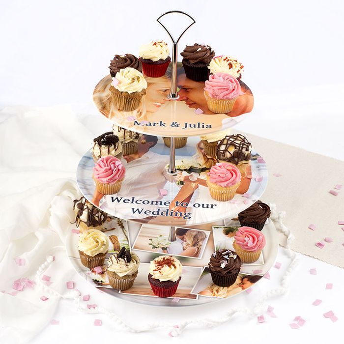 Personalisierte, dreistöckige Etagere aus Bone-China-Porzellan. Platz für ca. 24 Cupcakes, von Hand gefertigt, robust & leicht zu reinigen. Ideal als Geschenk oder für eigene Partys.