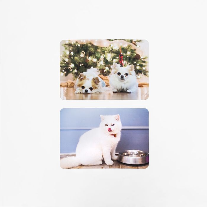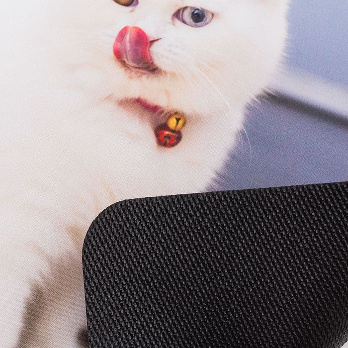 Die Napfunterlage selbst gestalten kannst du in vier verschiedenen Größen für für Hunde, Katzen und natürlich auch andere Haustiere. Die kleinste Variante ist perfekt für Katzen und kleine Hunde geeignet. Sie besteht aus den gleichen hochwertigen Materialien, wie die drei größeren Versionen, unterscheidet sich jedoch in einigen Punkten: Die kleine Matte hat abgerundete Ecken und keinen schwarzen Rahmen auf der Vorderseite. Du gestaltest also die gesamte Oberfläche der Unterlage mit deinen Fotos oder dem Namen deines Haustiers.