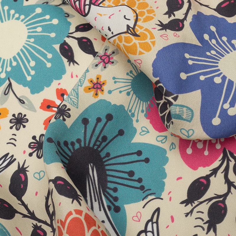 100% reine Seide in feiner Köperbindung. Fließend und weich. Eleganter Fall. Mattes Finish. Leicht und trotzdem strapazierbar. Exzellenter Druck. Produktion 2-3 Tage.