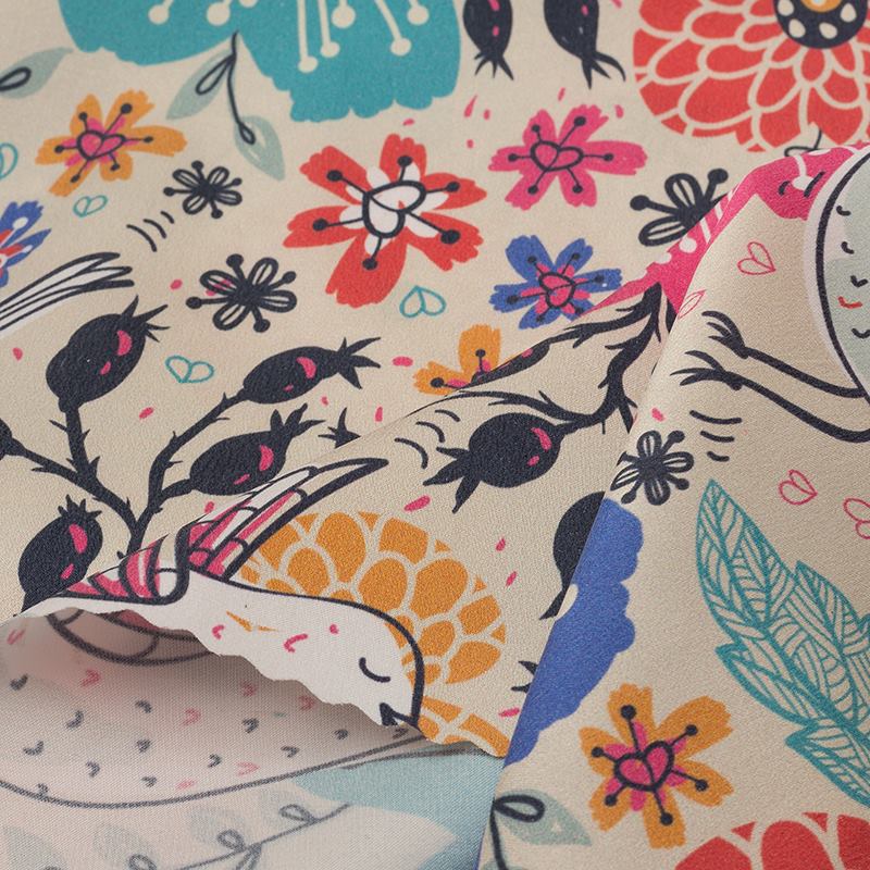 70% Baumwolle, 30% Seide. Leichter Voile-Stoff mit sanftem Fall. Druck ist 90% auf linker Seite sichtbar. Durch Reaktivdruck sind Farben und Schwarztöne besonders kräftig.