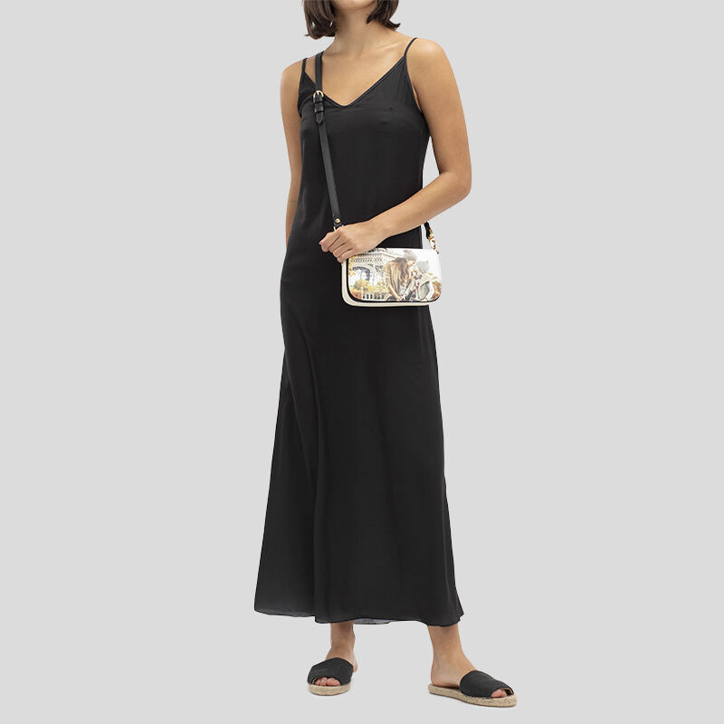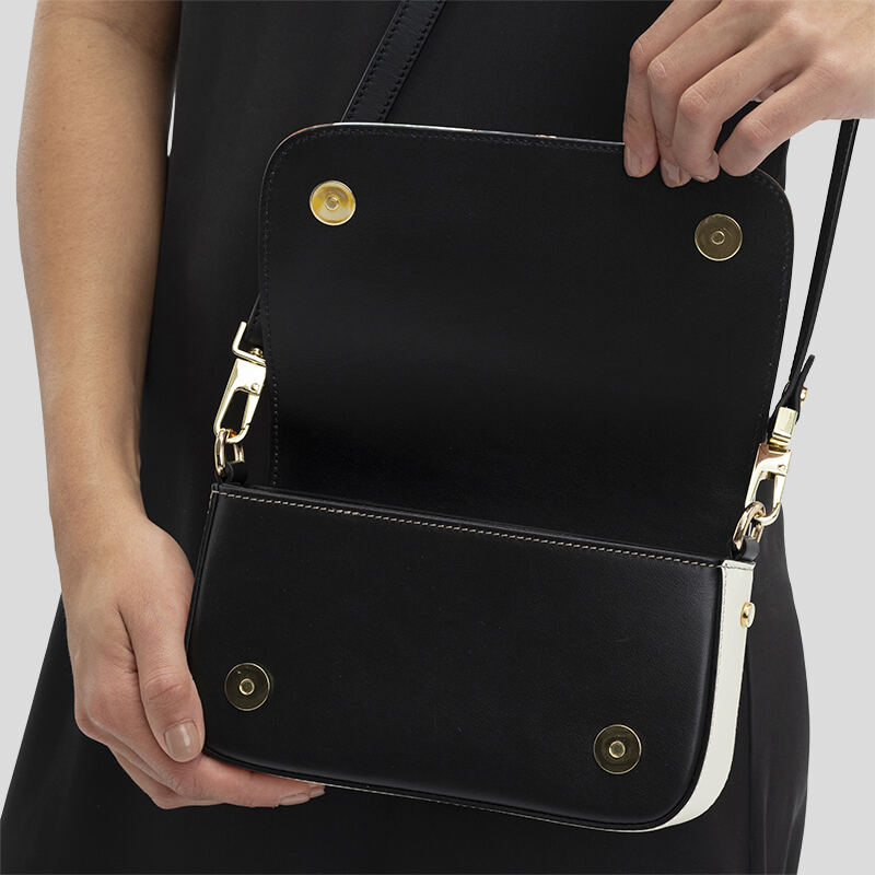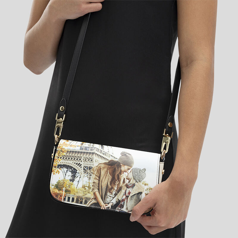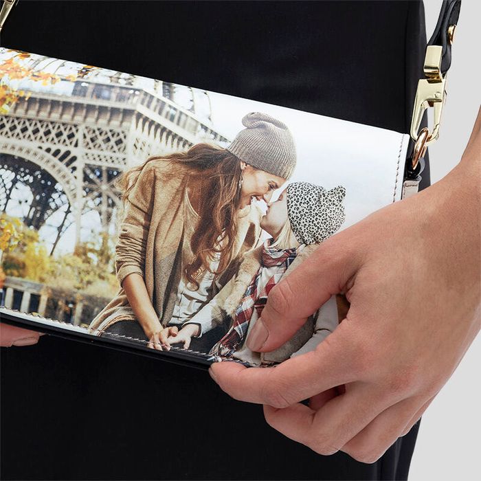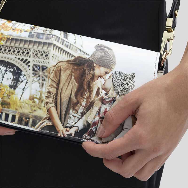Die unbedruckten Teile deiner Tasche sind aus glattem schwarzem Nappaleder gefertigt. Dazu gehören die Taschenrückseite, die von der Klappe verdeckten Teile, die D-Ring-Laschen und die Riemen. So bekommen deine Fotos die Gelegenheit, sich abzuheben und im Mittelpunkt deiner personalisierten Foldover-Abendtasche zu stehen. Du hast die Wahl zwischen zwei verstellbaren Riemen, von denen einer abnehmbar und komplett aus Nappaleder gefertigt ist, während der andere Riemen aus teilweise Nappaleder und teilweise aus einer Metallkette besteht und fest mit der Tasche verbunden ist. Der abnehmbare Lederriemen ist von 130 cm bis 139,5 cm verstellbar, während der Ketten- und Lederriemen von 114 cm bis 128 cm verstellbar ist.