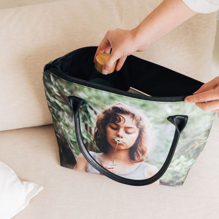 Die Henkel deiner personalisierten Handtasche mit Reißverschluss bestehen aus hochwertigem Leder und sind parallel zum Reißverschluss an der Außenseite der Tasche befestigt. Bitte positioniere dein Foto unter den Griffen, um zu vermeiden, dass Details deines Designs verdeckt werden. Nutze unsere praktische Produktvorschau, um einen genauen Eindruck des Endergebnisses zu erhalten, bevor du deine Bestellung abschließt.