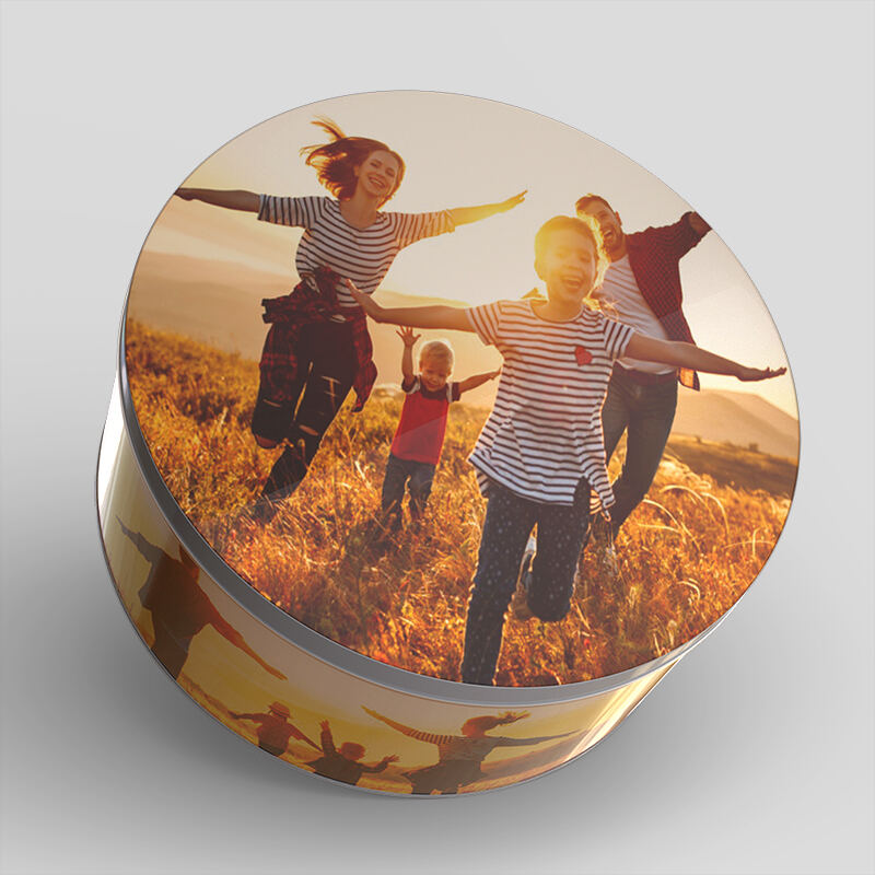 Deine Fotos drucken wir auf die Oberseite des Deckels, wobei das Motiv knapp vor den Rändern endet. Die Seiten der runden Dose werden in einem durchgehenden Streifen bedruckt. Das bedeutet, dass die Ränder deines Designs auf der Rückseite aufeinandertreffen.