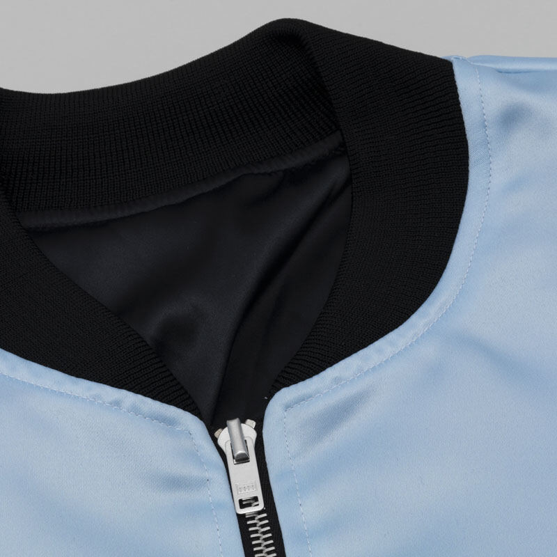 Setze ein Statement indem du luxuriösen Duchesse Satin für die Außenseite und das Innenfutter wählst. Auch hier kannst du die Farbe der Bündchen, des Innenfutters und des Reißverschlussbands wählen. Eine Jacke mit schwarzen Bündchen wird schwarzes Innenfutter und Reißverschlussbänder haben. Jacken mit weißen Bündchen haben weißes Innenfutter und Reißverschlussbänder. Eine Bomberjacke mit grauen Bündchen ist mit schwarzem Innenfutter aus Satin und grauem Reißverschlussband ausgestattet. Auch hier ist der Reißverschluss selbst Silber.