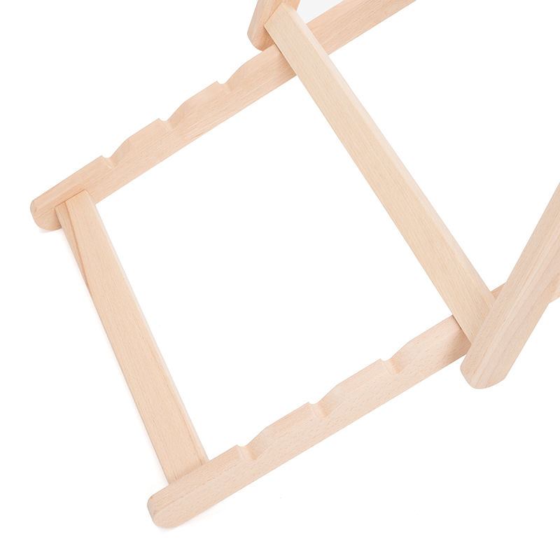 Jeder einzelne Liegestuhl wird in Handarbeit in unserem Studio hergestellt. Wir nutzen FSC-Zertifiziertes Buchenholz, das aus nachhaltigen Wäldern stammt und mit einer gesunden hellen Farbe überzeugt. Einer unserer Mitarbeiter schraubt, schleift und stutzt die Einzelteile zurecht, während ein anderer den Stoff zurechtschneidet.