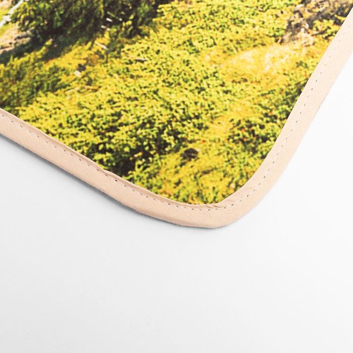 Wir empfehlen große Flächen mit der selben Farbe zu vermeiden. Es kann vorkommen, dass die gummierte Rückseite durch den Stoff hindurchgesehen werden kann, also nutze Muster mit vielen Details oder eine Fotocollage, um dem entgegenzuwirken. Der Saum ist in sechs verschiedenen Farben erhältlich: Schwarz, Grün, Beige, Bordeaux, Rosa und Blau. Wähle die Farbe, die am besten zu den Motiven auf der Matte passt, um ein harmonisches Gesamtbild zu kreieren.