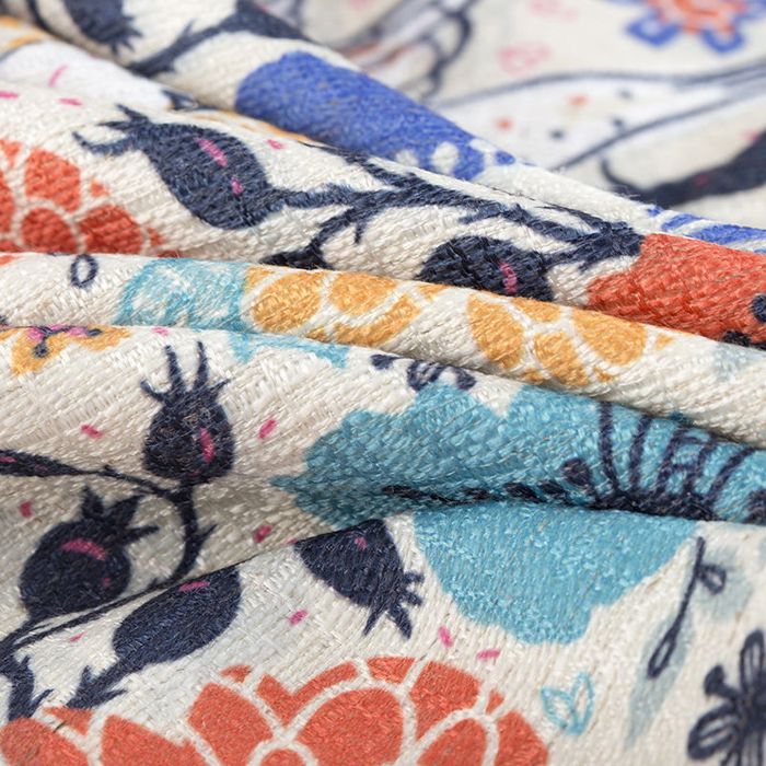 Mittleres Gewicht, atmungsaktiv und rustikal. Ohne Stretch. Pigmentdruck auf 95% Baumwolle, 5% Leinen. Warme beige Ausgangsfarbe, entsättigtes Vintage-Finish.