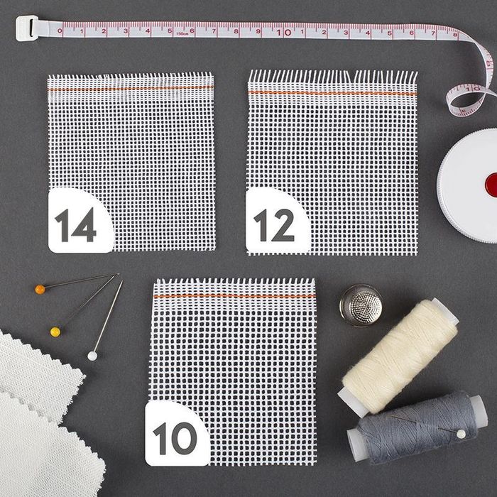 Die Lochanzahl ist wahlweise erhältlich in 10, 12 oder 14, je nachdem, wie fein das gestickte Ergebnis aussehen soll (und auch ob die Vorlage für Anfänger oder Fortgeschrittene ist).