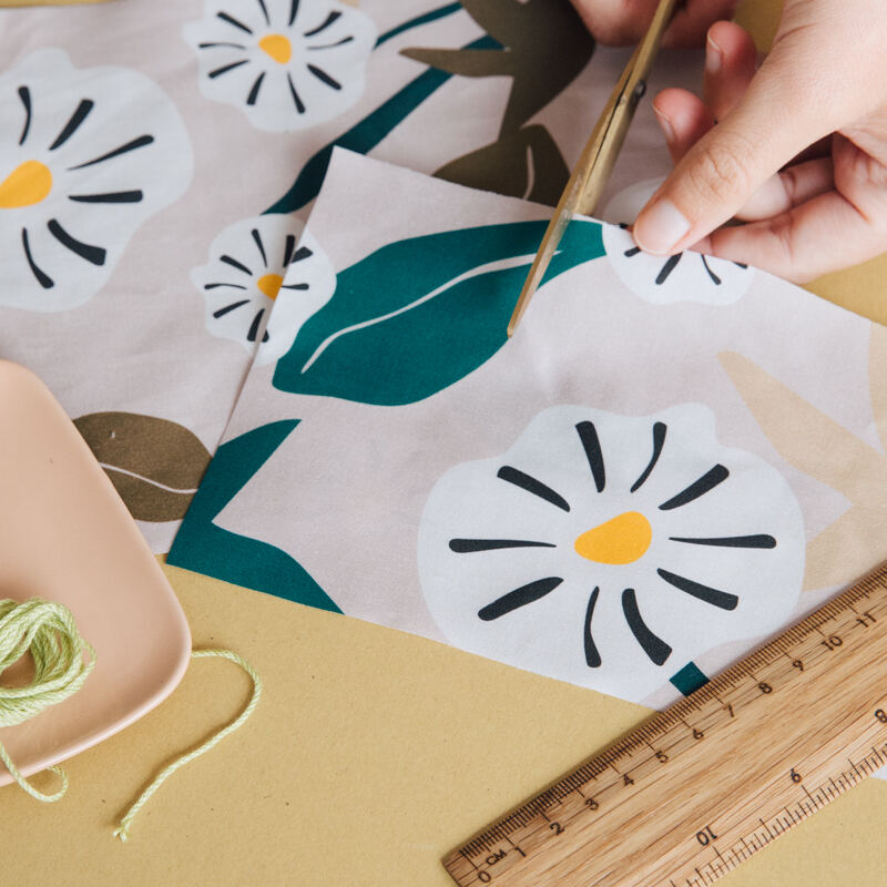 Deine Stoffstücke werden grob rund um den Druck zugeschnitten, d.h. dass ein schmaler weißer Rand rund um dein Design stehen bleibt.