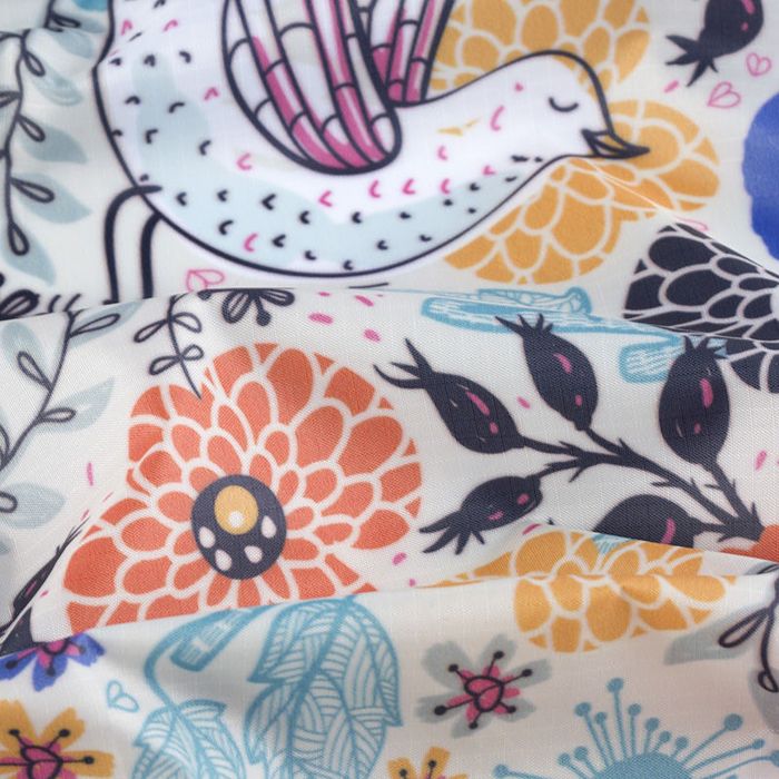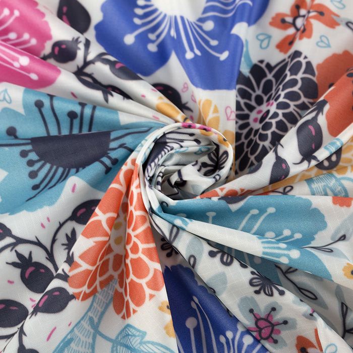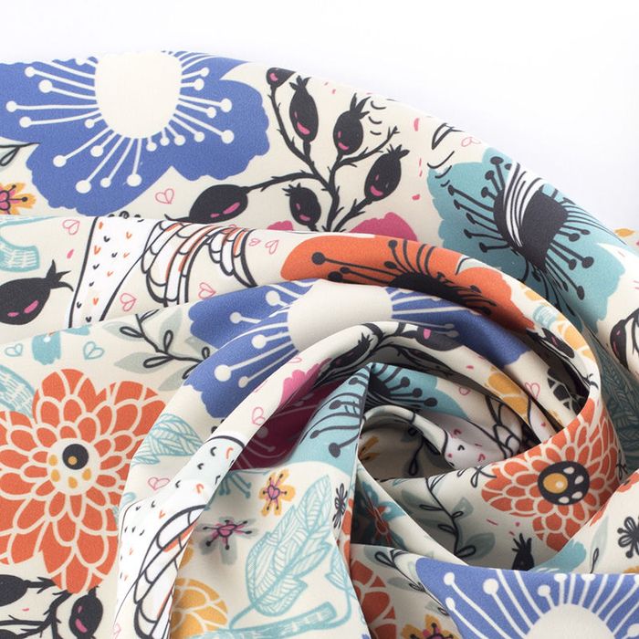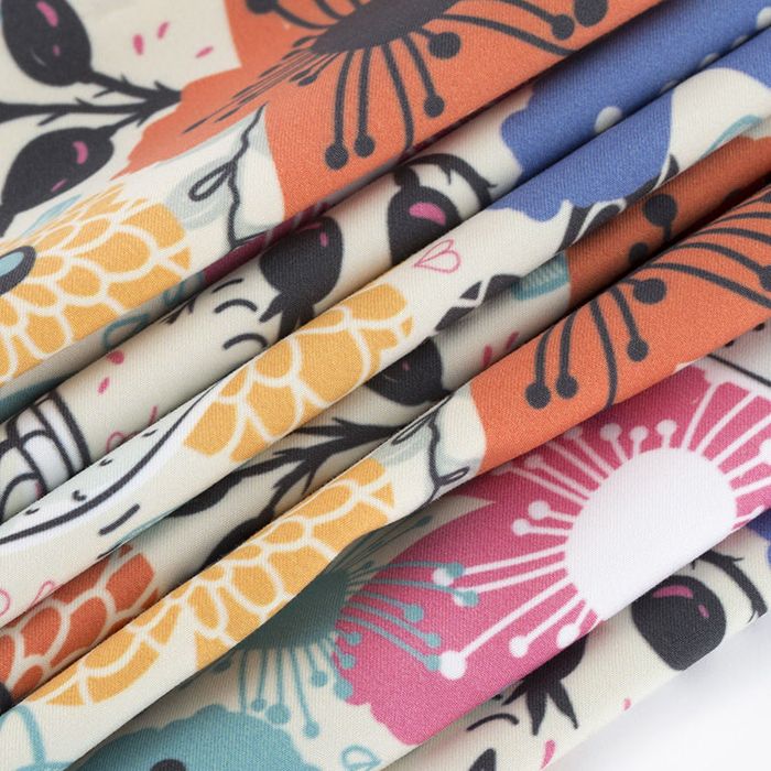 Deine Designs drucken wir auf Bahnen des von dir ausgewählten Materials und schneiden diese dann in die gewünschte Größe zurecht. Um deinen Stoff zu bedrucken verwenden wir eines von zwei Verfahren, abhängig von der Zusammenstellung der Fasern. Stoffe aus Naturfasern bedrucken wir mit Hilfe eines besonderen Druckers, der deine Bilder direkt auf den Stoff druckt. Künstliche Textilien hingegen werden zusammen mit einem bedruckten Transferpapier in eine Hitzepresse gegeben. Bei hoher Temperatur verdampfen die Farben, wobei die Partikel tief in den Stofffasern verankert werden.