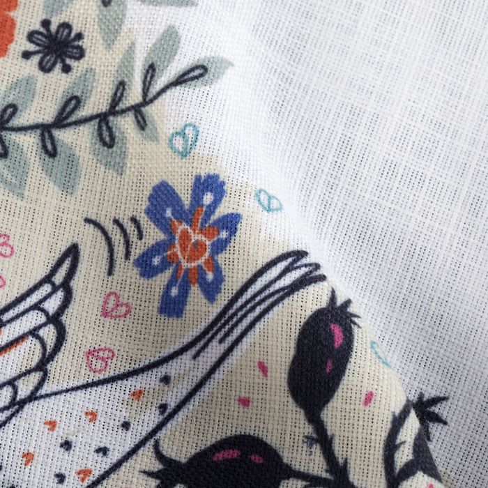 70% Baumwolle, 30% Seide. Leichter Voile-Stoff mit sanftem Fall. Druck ist 90% auf linker Seite sichtbar. Durch Reaktivdruck sind Farben und Schwarztöne besonders kräftig.