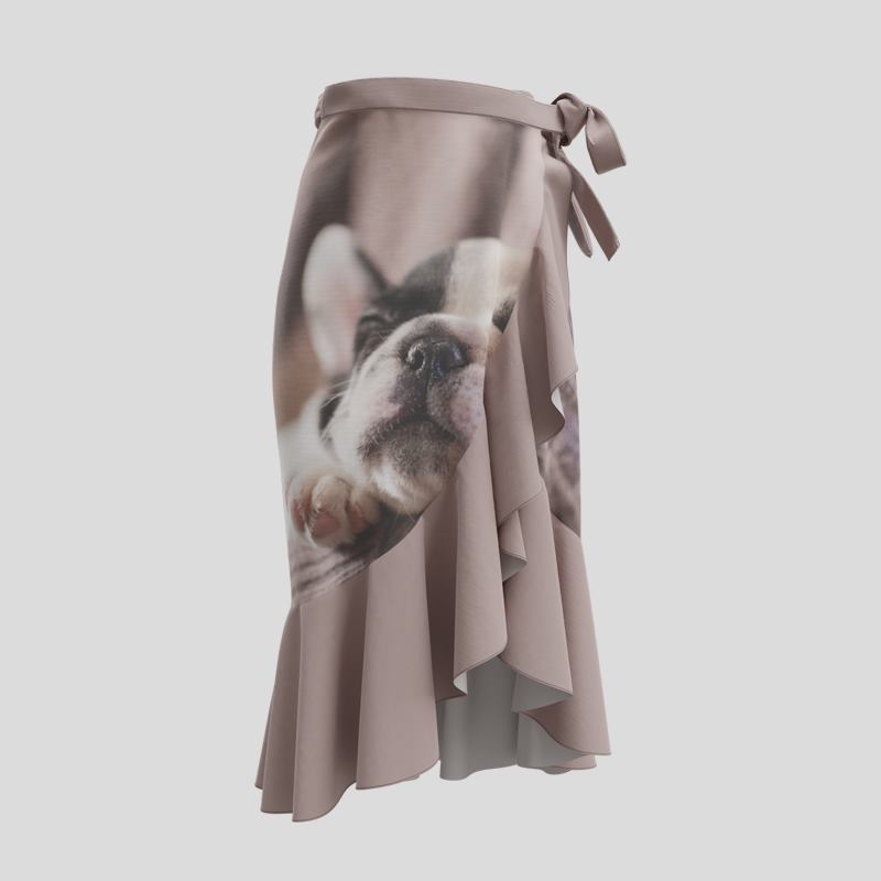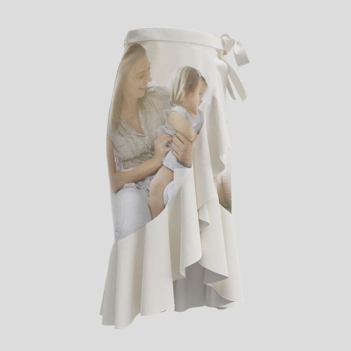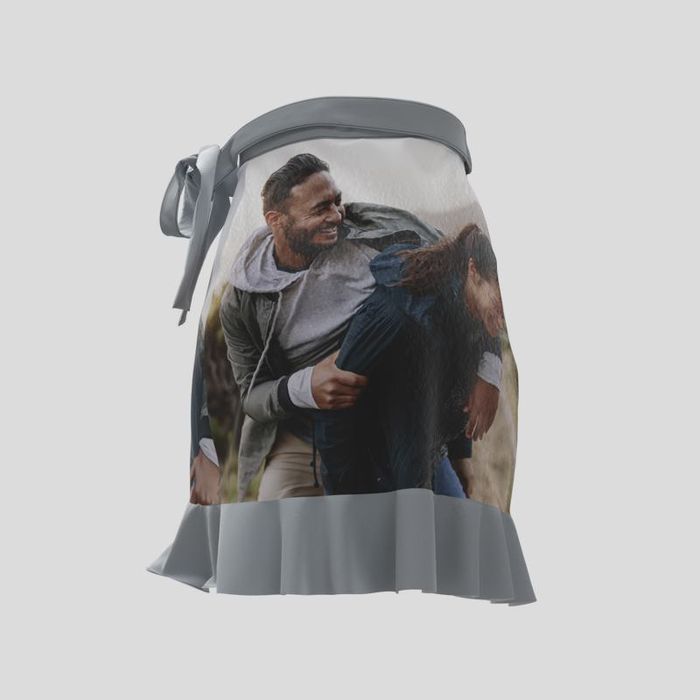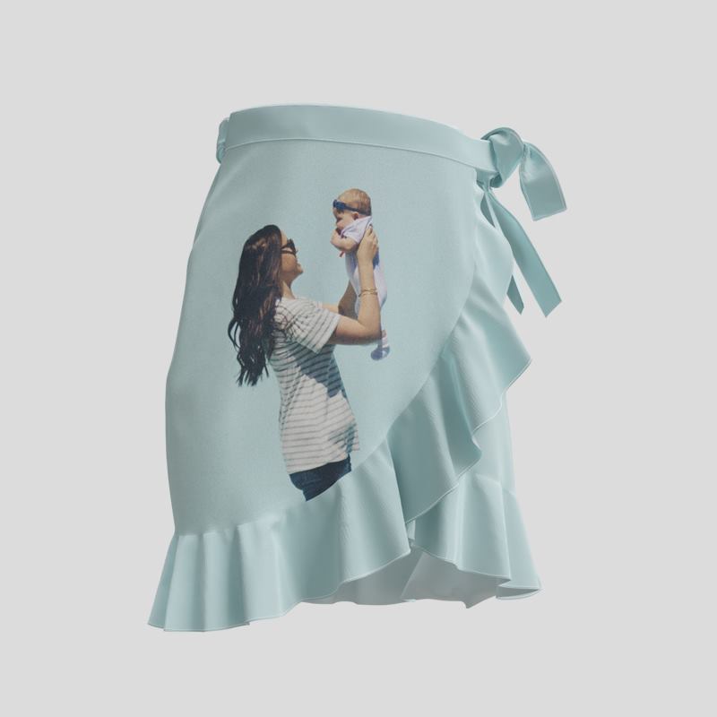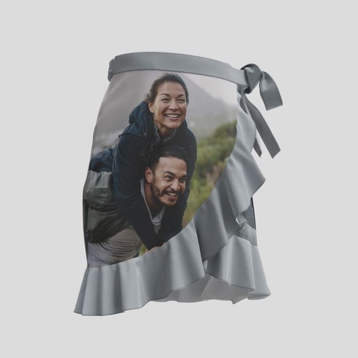 Kombiniere romantische Schnitte mit modernem Street-Style, indem du deine Fotos auf diesen Wickelrock mit Volant drucken lässt.