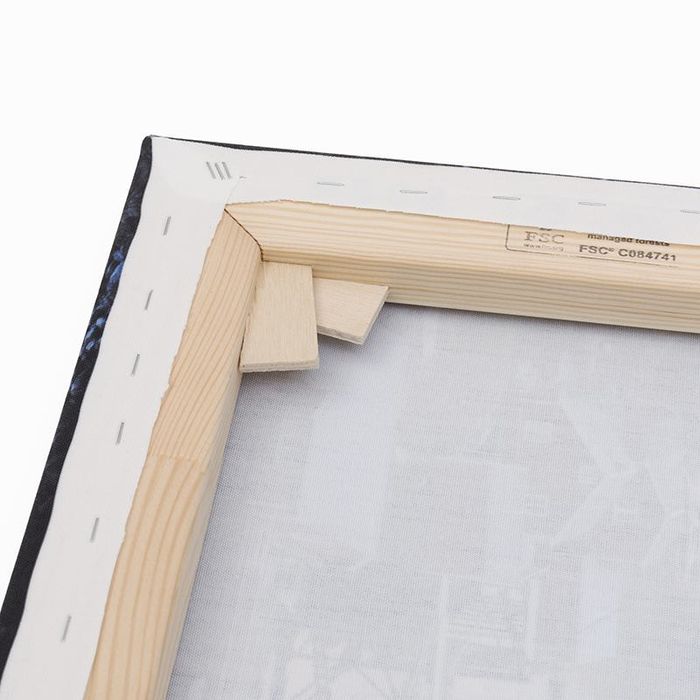 In der Zwischenzeit stellt ein weiterer Mitarbeiter unseres Studios den Rahmen deiner zweiteiligen Leinwand her. Wir nutzen nachhaltiges FSC-Zertifiziertes Kiefernholz, das geschliffen und schließlich mit einer speziellen Beschichtung versehen wird, damit sich deine Leinwand auch in feuchten Umgebungen, wie dem Badezimmer, nicht wölben oder verziehen wird. Wenn der Keilrahmen Form angenommen hat wird die Leinwand mit Heftklammern befestigt. Acht Hartholzkeile werden in die Ecken des Keilrahmens getrieben, um auch in Zukunft die Spannung der Leinwand aufrecht zu erhalten und dir so eine lebenslange Garantie zu sichern.